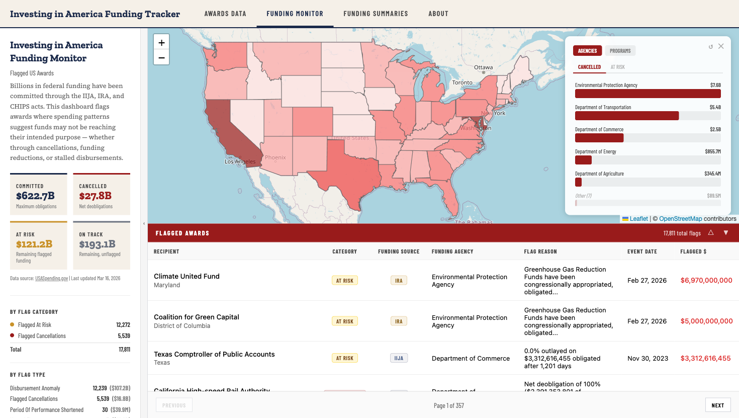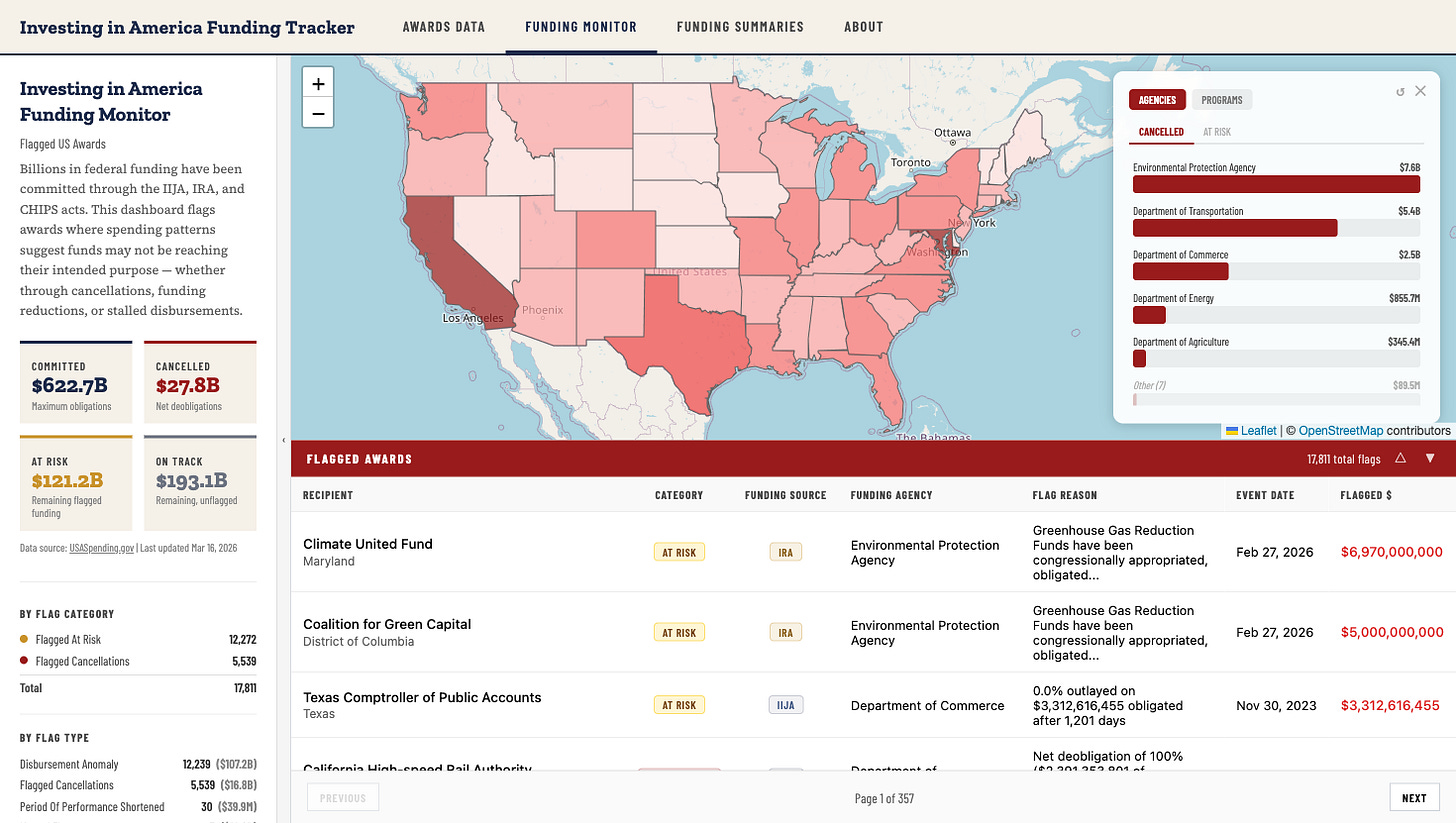 The Investing in America Funding Tracker covers more than 500,000 awards totaling over $622 billion in federal commitments, filterable by state, county, congressional district, agency, and funding program. Critically, it doesn’t just show what was promised and what has gone out the door — it flags what’s in jeopardy: clawed back funds, canceled projects, delayed disbursements, compressed timelines, and projects where other actions by the Trump administration have put funds at risk.