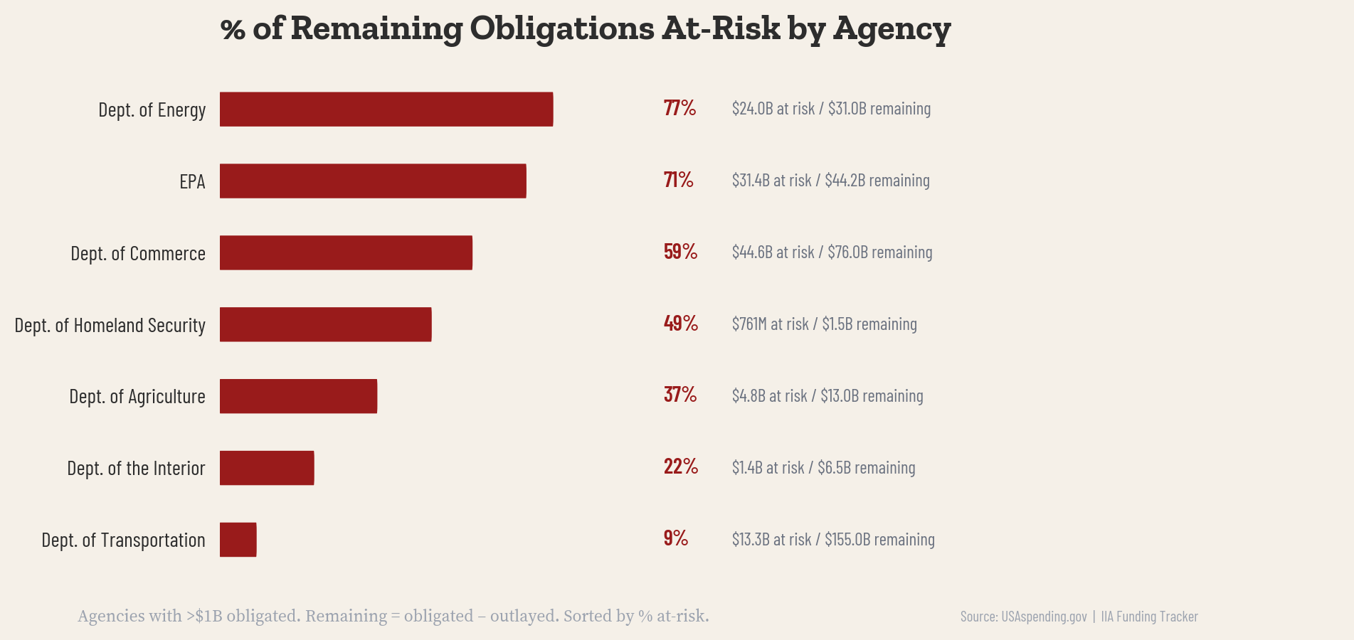 Out of $622 billion in committed funds, $27 billion has been canceled and only $280 billion has actually reached projects on the ground. Of the remaining $314 billion, $121 billion — nearly one in five dollars that Congress appropriated and the government contractually committed to — is at risk of never making it to the intended recipients. That’s not a projection or an estimate. It’s what the data shows in the Investing in America Funding Tracker, a tool I built to provide a real-time view of where these funds stand: how much has been obligated, how much disbursed, and how much is in jeopardy.